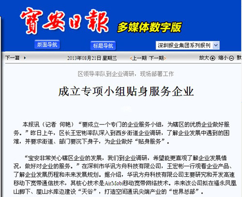 寶安區成立“華訊事務專項小組”,區長親任組長支持這家落戶寶安的先驅企業。該企業AirMobi技術解決了現在WIFI不能支持移動寬帶上網,這一移動與帶寬沖突世界級技